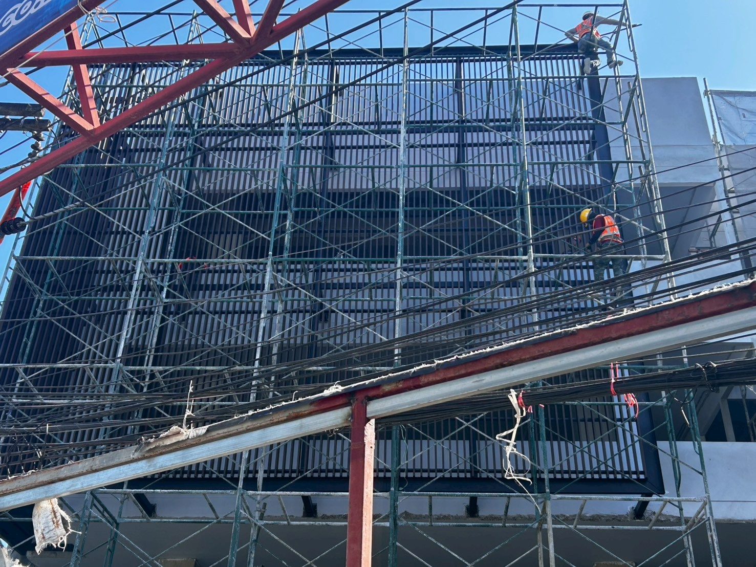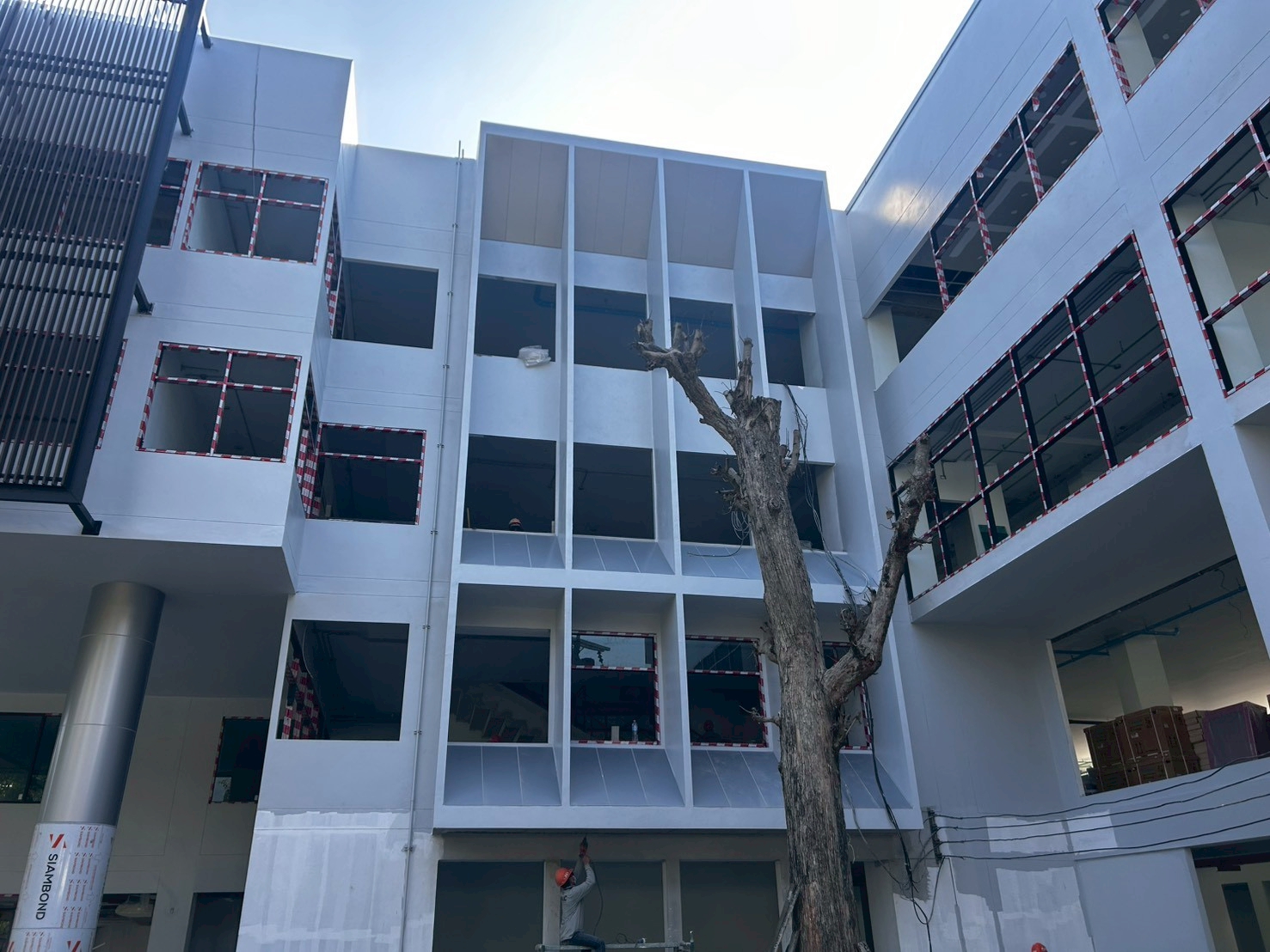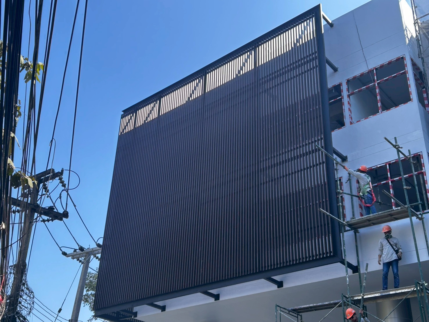 งานตกแต่งหน้าอาคารด้วยระแนงลายไม้กับอลูมิเนียมคอมโพสิต และงานผลิตและติดตั้งป้ายภายในภายนอกทั้งหมด